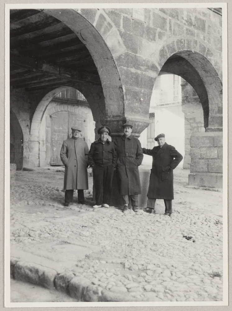 Jaime Sabartés, un [agent de police], Miquel Gaspar et Joan Vidal Ventosa sur une place de Horta de Sant Joan, Espagne, le 5 novembre 1956