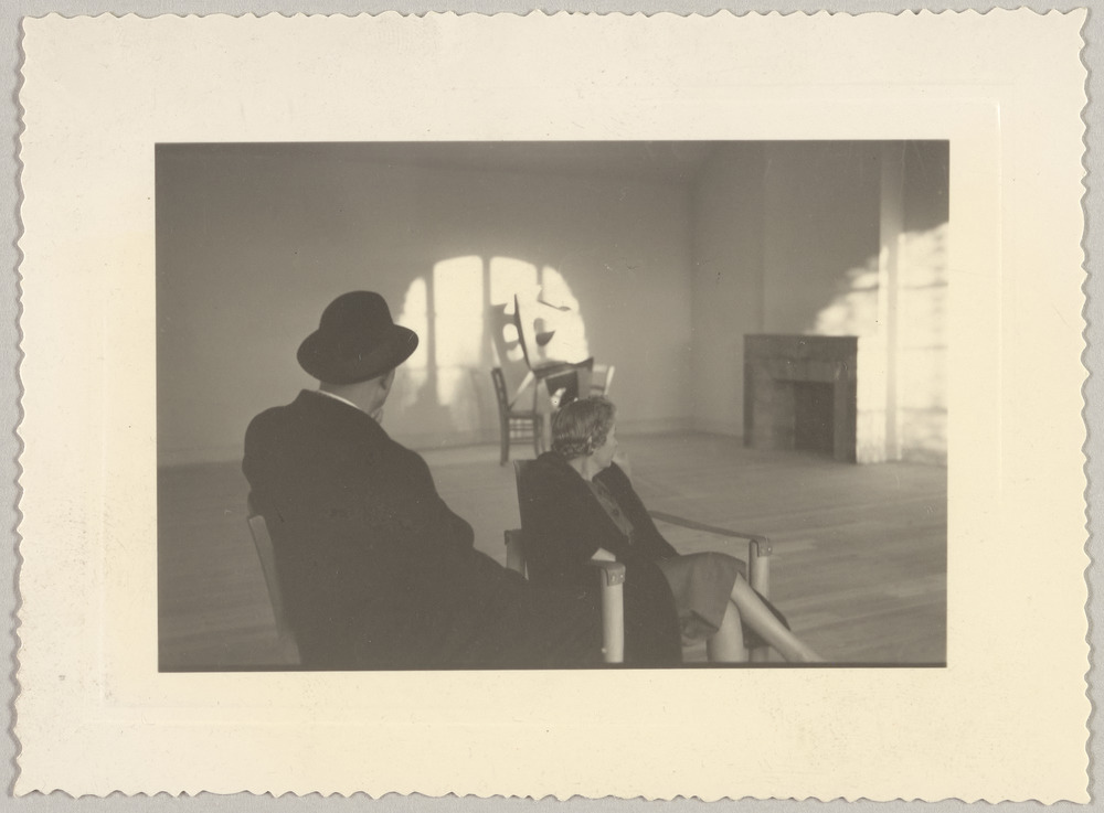 Jane Kootz et un homme non identifié au premier plan, et la sculpture "La Chaise" au second, Notre-Dame-de-Vie, Mougins