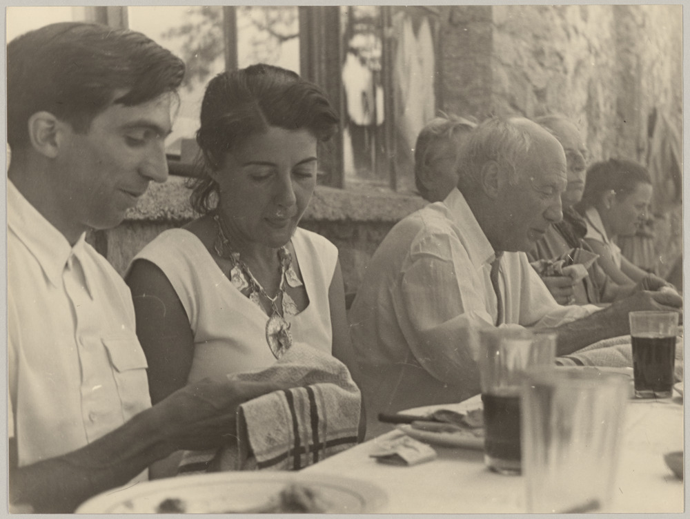 Javier Vilató Ruiz avec Paule de Lazerme et Pablo Picasso lors d'un déjeuner au Castellas, Céret, été 1954