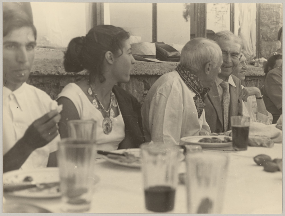Javier Vilató Ruiz, Paule de Lazerme, Pablo Picasso et Pierre Brune lors d'un déjeuner au Castellas, Céret, été 1954
