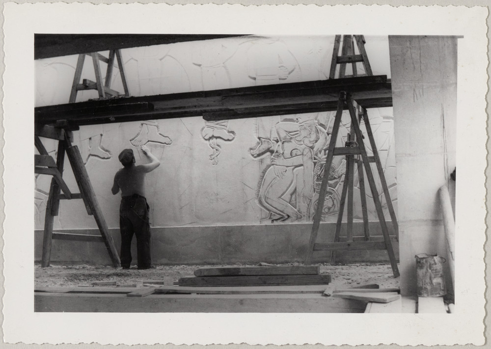 Jean-Charles Lallement travaillant sur un bas-relief du monument aux martyrs de la résistance de Nîmes, en 1954