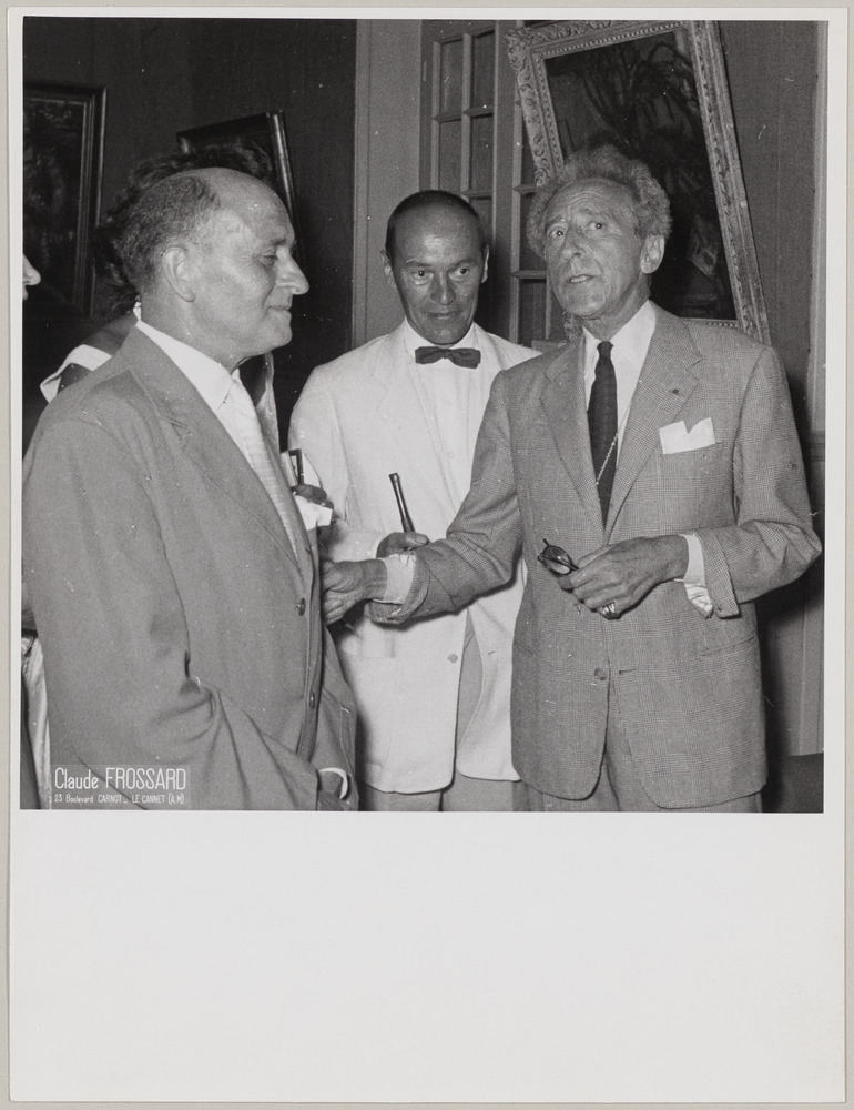 Jean Cocteau avec deux hommes non identifiés lors d'une exposition