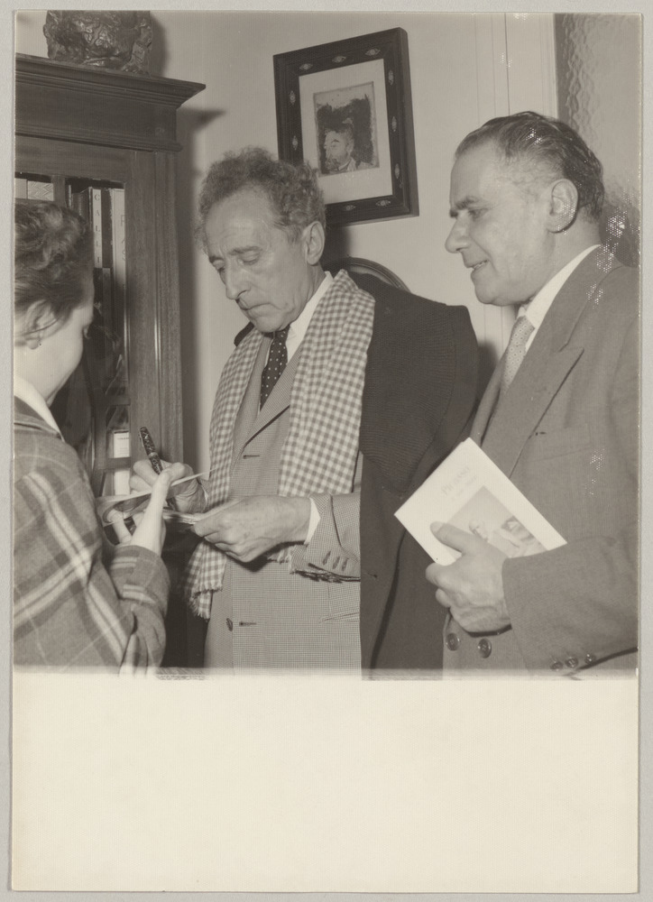 Jean Cocteau avec Henri Matarasso lors du vernissage privé "Un demi-siècle de livres illustrés" dans la Galerie d'Henri Matarasso, Nice, le 24 décembre 1956