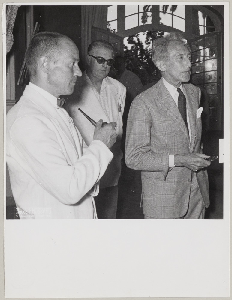 Jean Cocteau et deux hommes non identifiés lors d'une exposition