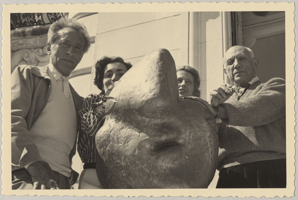 Jean Cocteau, Jacqueline Roque, Francine Weisweiller et Picasso appuyés sur la sculpture en bronze "Tête de femme", sur le perron de La Californie, Cannes