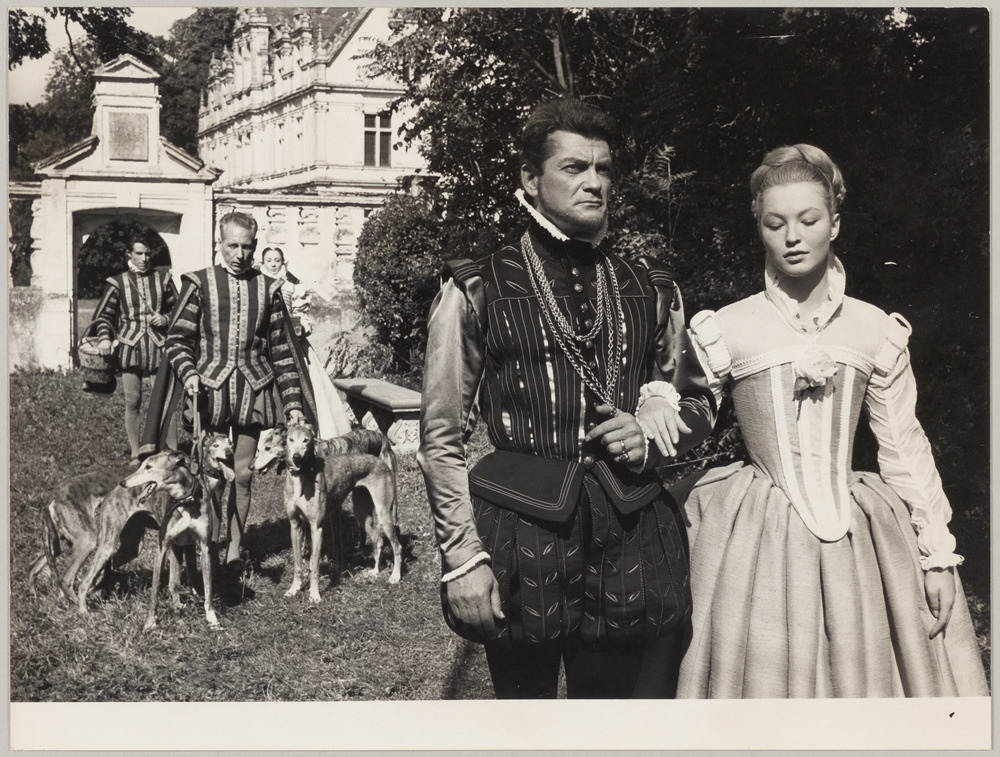 Jean Marais et Marina Vlady suivis de trois personnages dans "La Princesse de Clèves" de Jean Delannoy, en 1960-61