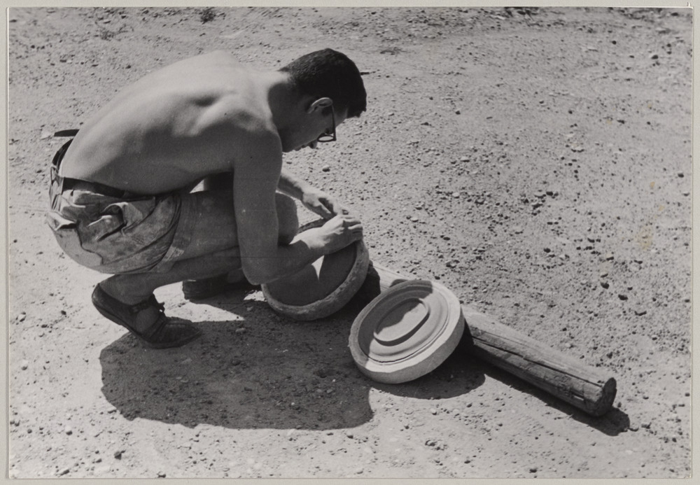 Jean Ramié enlevant les moules, accroupi dans la cour de l'atelier de Madoura, Vallauris