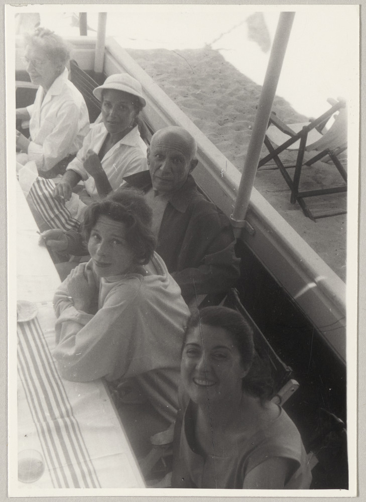 Jeanne de Rochette dite Totote avec Véra Clouzot, Pablo Picasso, [Bettina Graziani] et Paule de Lazerme au restaurant, plage de la Garoupe, Antibes, en 1955