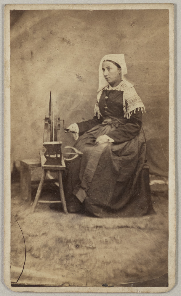 Jeune fille, au fichu et à la coiffe, assise à côté d'un rouet
