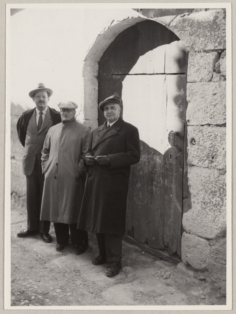 Joan Gaspar, Jaime Sabartés et Joan Vidal Ventosa devant la porte d'une maison à Horta de Sant Joan, Espagne, le 5 novembre 1956