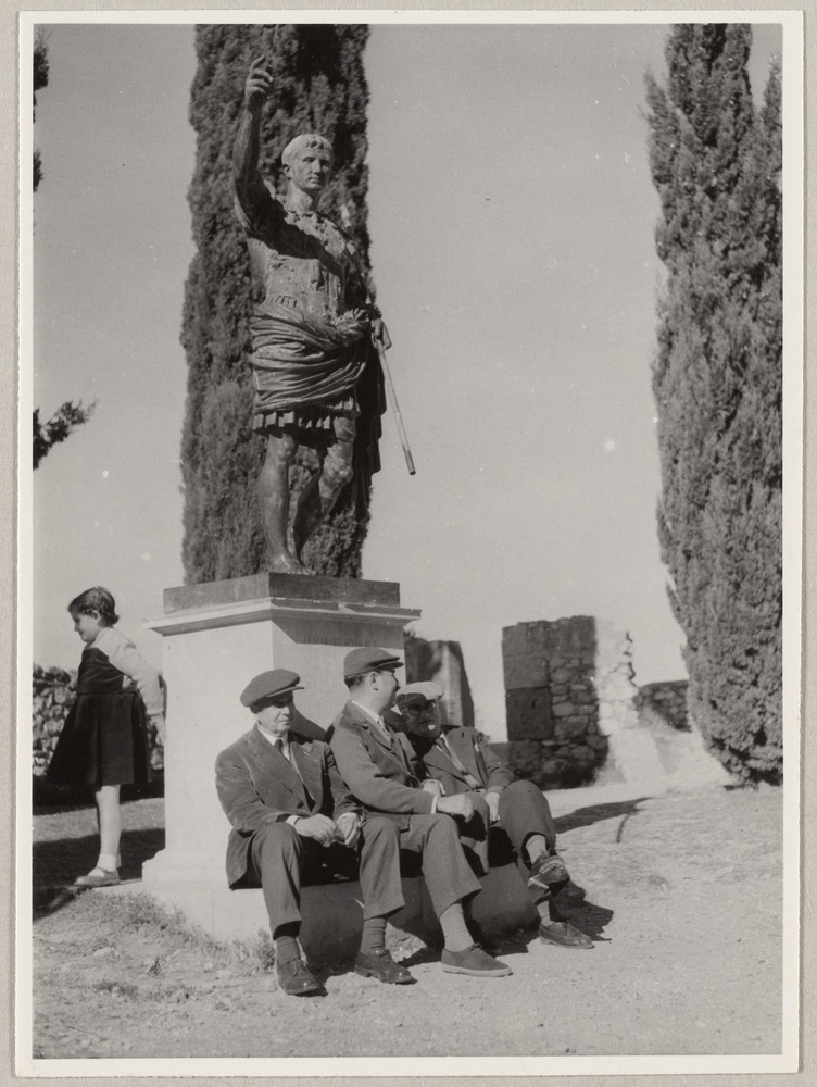 Joan Vidal Ventosa, Miquel Gaspar et Joan Sabartés assis au pied d'une statue romaine d'Auguste empereur, Tarragone, le 4 novembre 1956