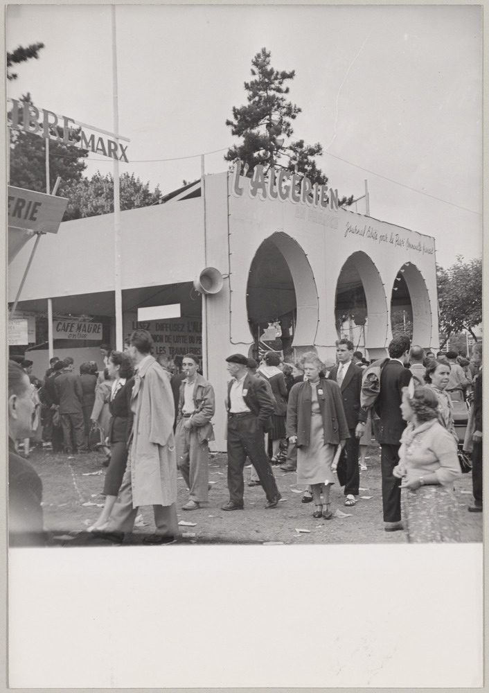 Kiosque du journal "L'Algérien en France" à la Fête de l'Humanité, Bois de Vincennes, le 7 septembre 1952