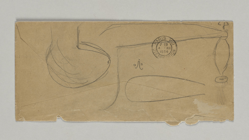 s'y ajoutent 3 autres éléments, la feuille contenue dans l'enveloppe, ainsi qu'une deuxième enveloppe et son contenant,regroupement de nature inconnue réalisé à une date inconnue