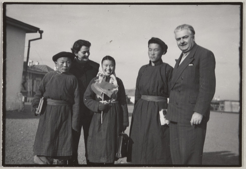 L'enveloppe contenait un petit tirage argentique NB de deux amis (probablement) de Pablo Picasso qui ont séjourné à Oulan-Bator. Avec se trouvent deux billets de Mongolie et deux timbres décollés et cachetés