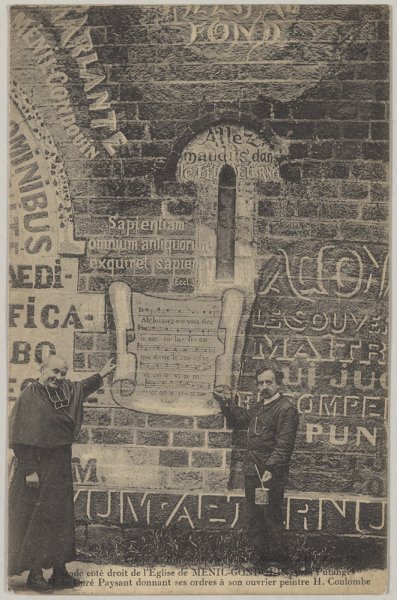 Le curé Victor Paysant avec l'ouvrier-peintre H. Coulombe devant l'église Saint-Vigor, dite église vivante et parlante, de Ménil-Gondouin