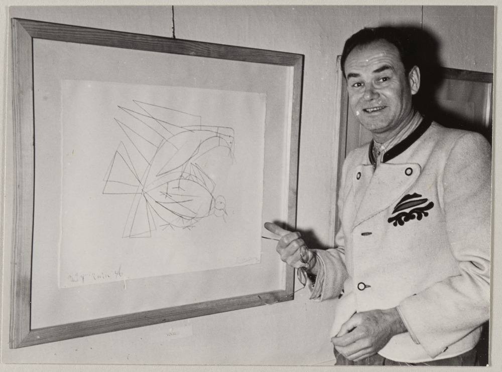 Le Dr F. devant une estampe datée de juin 1946 présentée à l'exposition "Pablo Picasso" de Lübeck, en juillet-août 1949