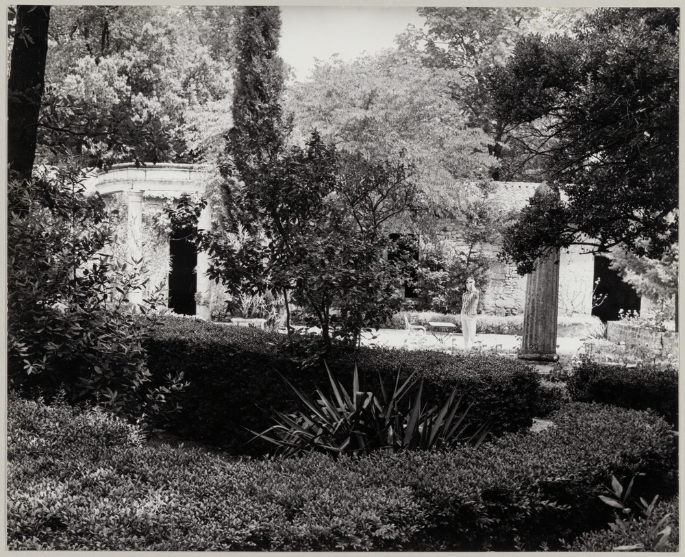 Le jardin du château de Castille avec le temple et une femme, propriété de Douglas Cooper, Rémoulins, en 1963