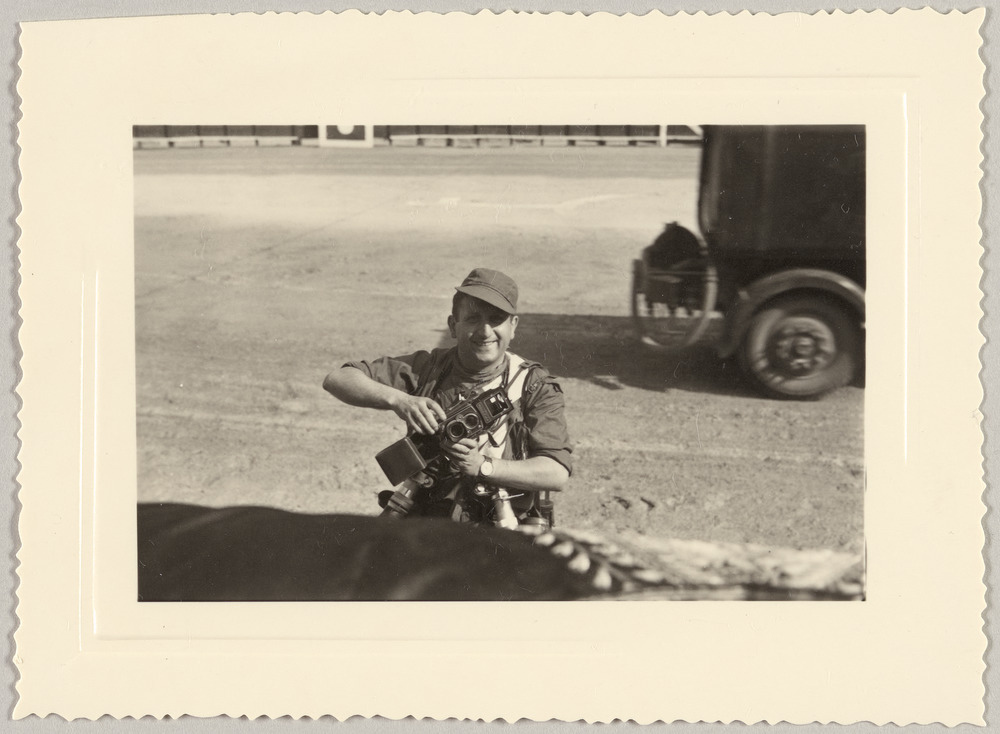 Le photographe Esteban Chapresto dans le callejon des arènes de Nîmes, en [1957 ou 1958]