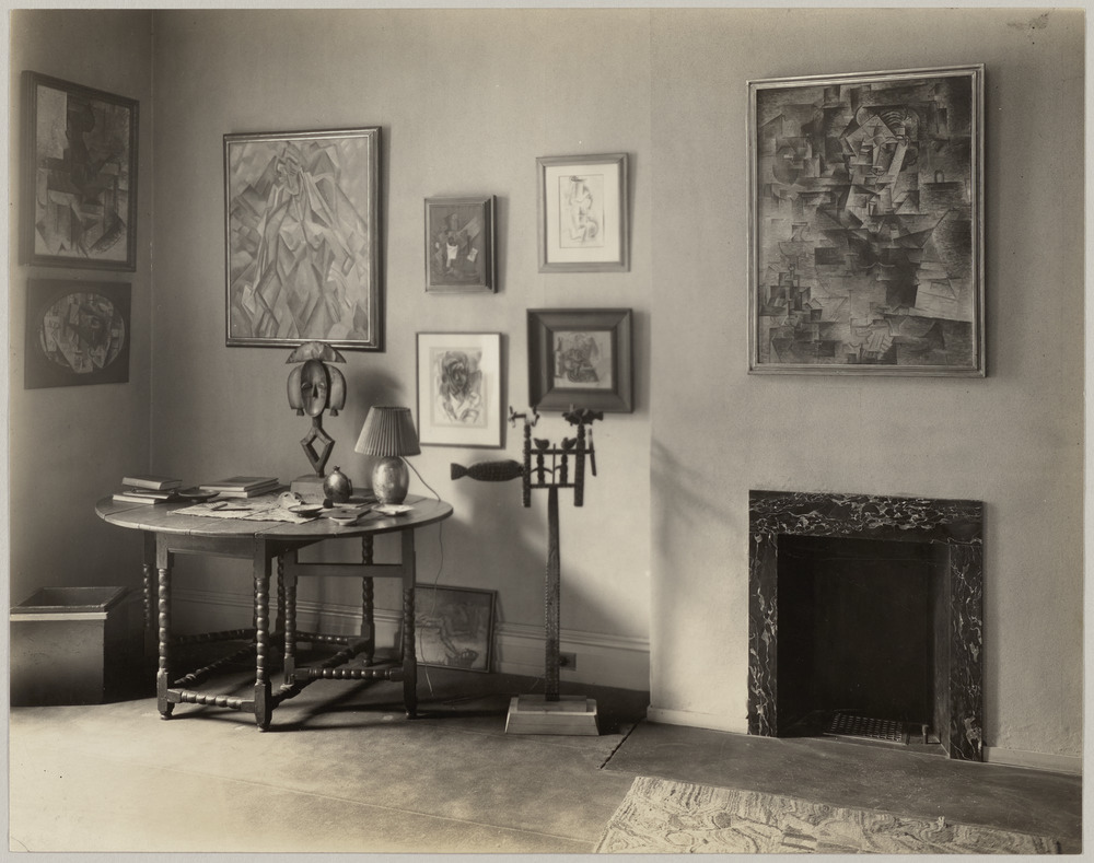 Présentes sur la photographie les oeuvres : "Nu dans un fauteuil" de 1909 (Coll. Lauder, MET), "Bouteille de Bass et verre" de 1914 (Coll. Lauder, MET), "Daniel-Henry Kahnweiler" de 1910 (Art Institute de Chicago) et "Bouteille, verre et journaux" de 1913 de Georges Braque sur le mur de gauche