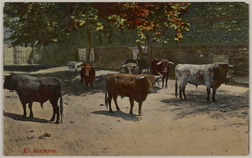 Annotation manuscrite au dos : "Pamplona 10 de Julio 1921 Cuarta de feria Toros de Guadalets, pequenos nobles y suaves.