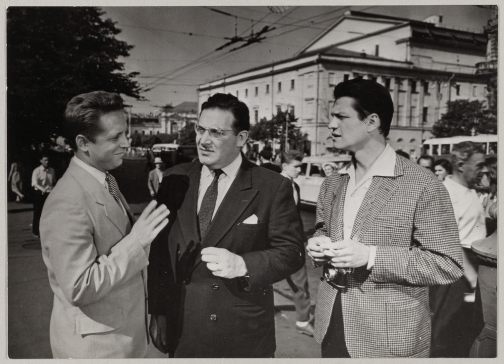Léon Zitrone et deux hommes dans une rue, tournage de [20000 lieux sous la terre]