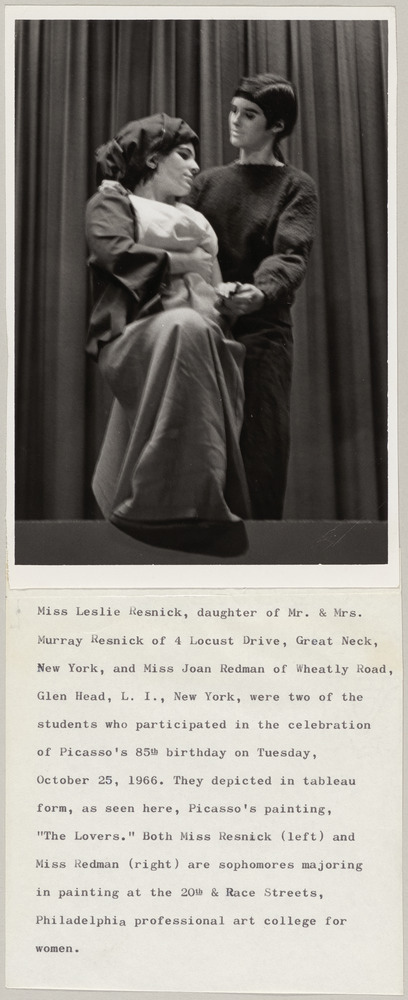 Leslie Resnick et Joan Redman mimant un tableau de Picasso lors de la célébration du 85th anniversaire de Picasso, le 25 octobre 1966, [New York ou Philadelphie]