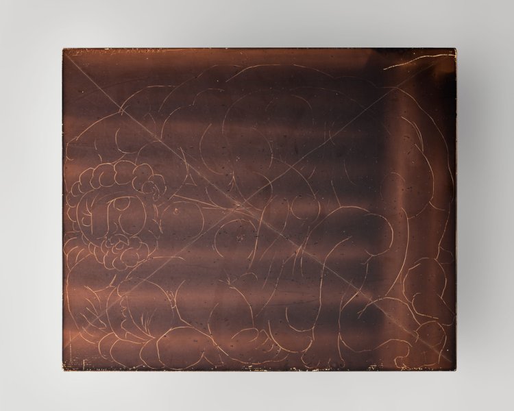 Pointe sèche sur cuivre. Plaque rayée et vernie