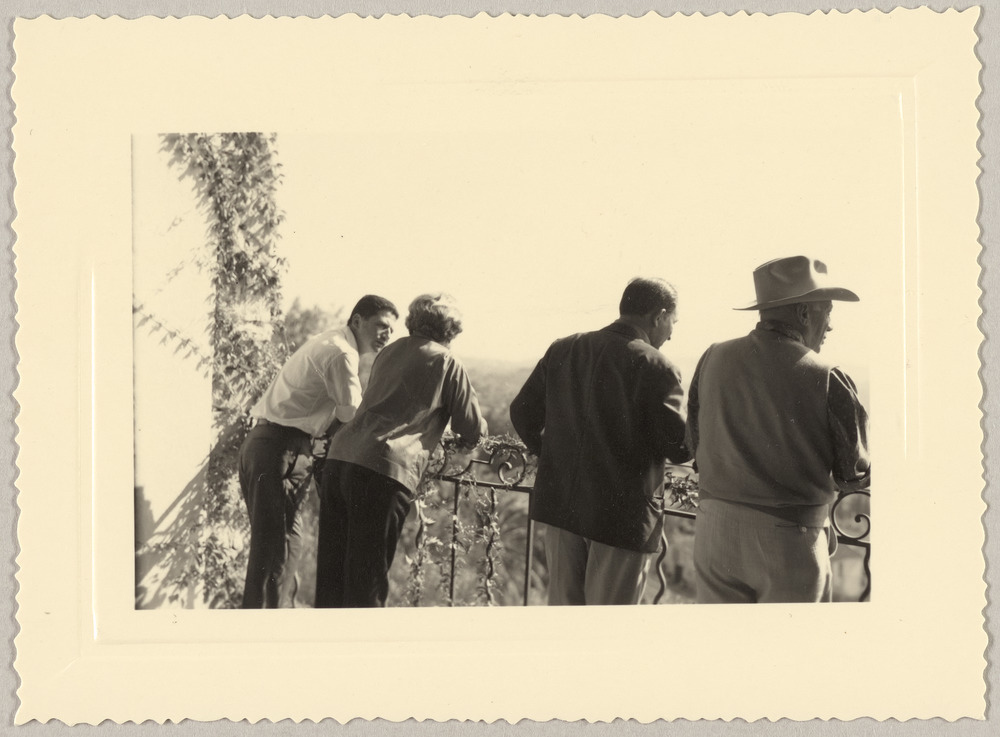 Lionel Prejger, Louise Leiris, un homme non identifié et Pablo Picasso sur un balcon à Notre-Dame-de-Vie, Mougins, en 1962