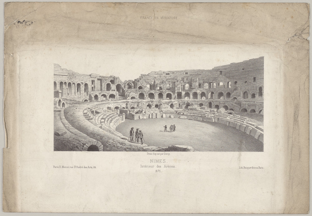 Lithographie "Vue de Nîmes - Intérieur des Arènes - Amphithéâtre Romain" de 1860 par Isidore Laurent Deroy
