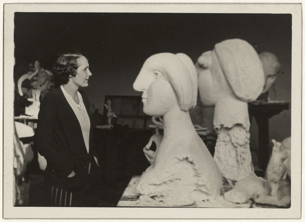 Louise Leiris regardant les sculptures en plâtre "Tête de femme" et "Buste de femme" dans l'atelier de Boisgeloup, Gisors, dans les années 1930