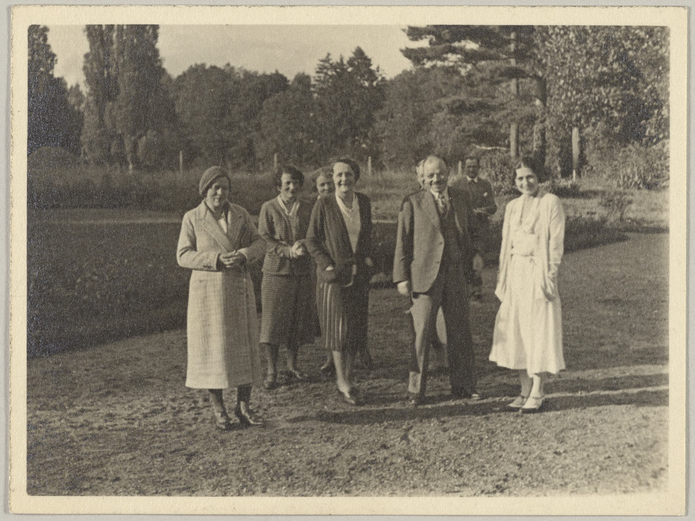 Lucie Kahnweiler, Berthe Lascaux, Louise Leiris, Elie Lascaux et Olga Picasso, et derrière, Jeanne Godon, Pablo Picasso et Daniel-Henri Kahnweiler, dans le jardin de Boisgeloup, Gisors, dans les années 1930