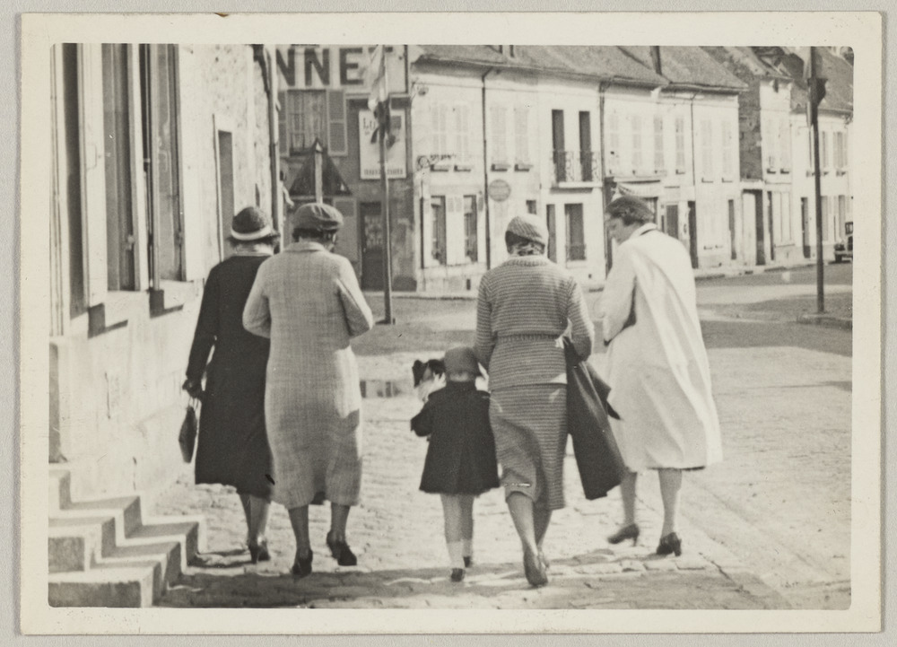 Lucie Kahnweiler, Louise Leiris et Madame Lascaux accompagnées d'une enfant et d'une femme dans une rue de Gisors, années 1930