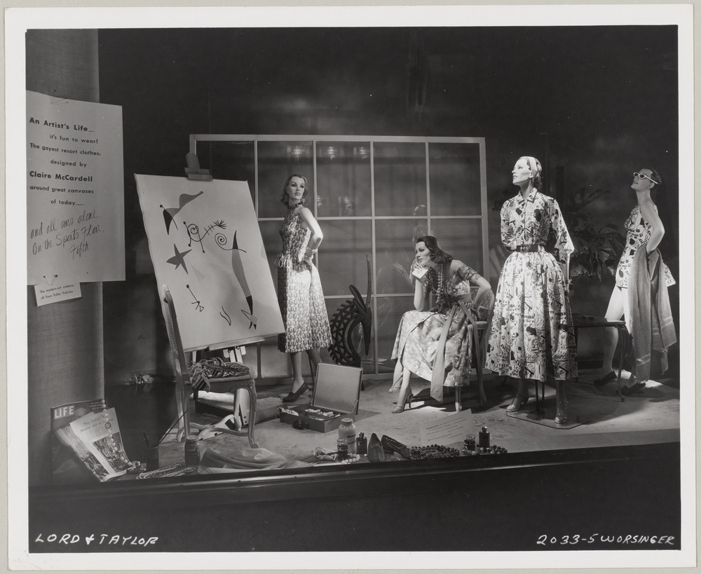 Mannequins portant des robes faites en tissus dessinés par Léger, Picasso, Chagall et Dufy lors de l'exposition "Artists in Fabrics" du Brooklyn Museum, en 1955-56