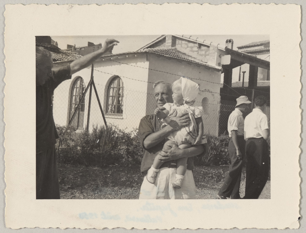 Manuel Ángeles Ortiz dit Manolo Ortiz et Pablo Picasso tenant dans ses bras Eva Jupiter bébé, Vallauris, en août 1950