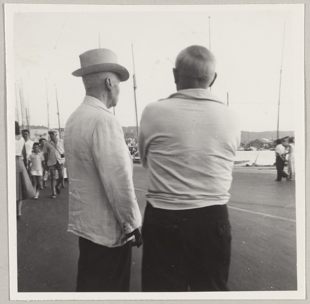 Manuel Pallarès et Pablo Picasso, vus de dos, sur le port de Saint-Tropez, circa 1956