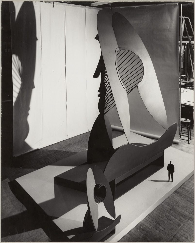 Maquettes vues de dos de la future sculpture monumentale "Tête" du Chicago Civic Center (Daley plaza) dans l'atelier de l'American Bridge Company, Gary, Indiana, en 1966-67