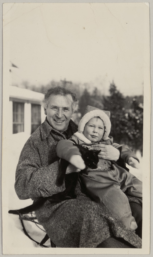 Marc Chagall avec son fils David McNeil et un chat noir sur une luge