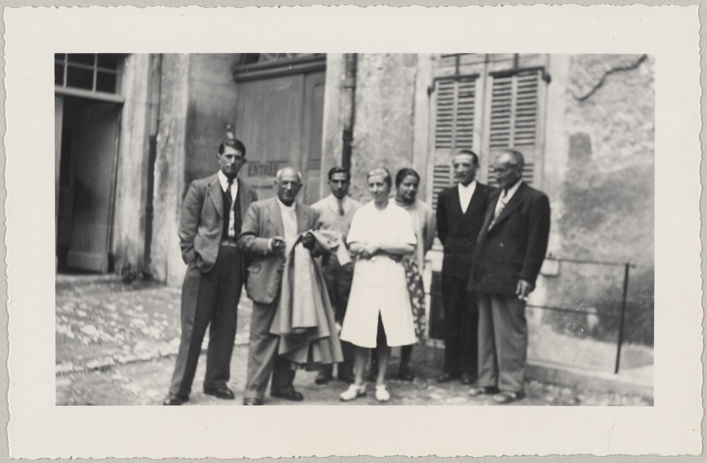 Marcel Boudin, André Castel et sa femme, Matsi Hatzilazarou, Javier Vilató Ruiz, Pablo Picasso, Paul Picasso dans la cour du laboratoire d'oenologie d'André Castel, rue Bernard-Lazare, Nîmes, circa 1948