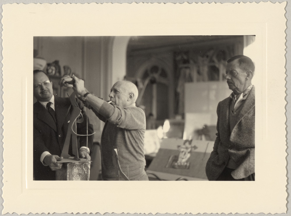 Marcel Duhamel observant Pablo Picasso exécuter une sculpture en tôle avec l'aide de Joan Gaspar dans l'atelier de La Californie, Cannes, en 1961
