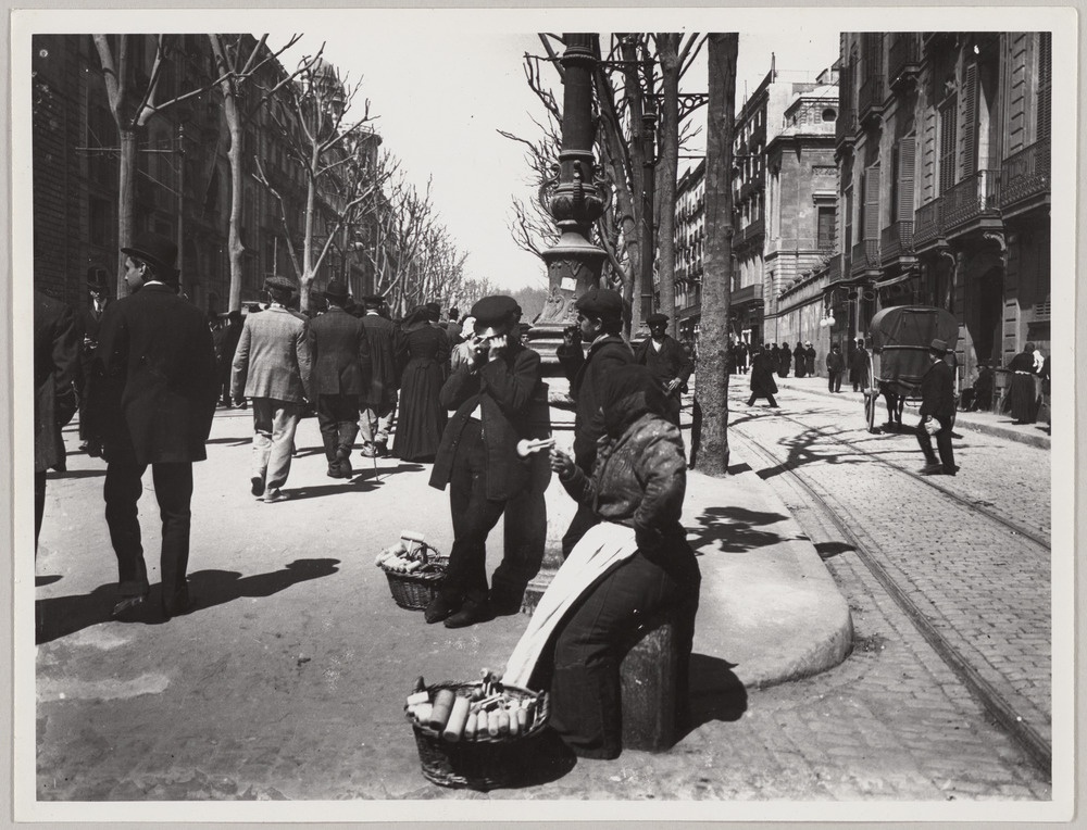Marchands ambulants devant le Palau Moja, La Rambla, Barcelone, en 1907-08