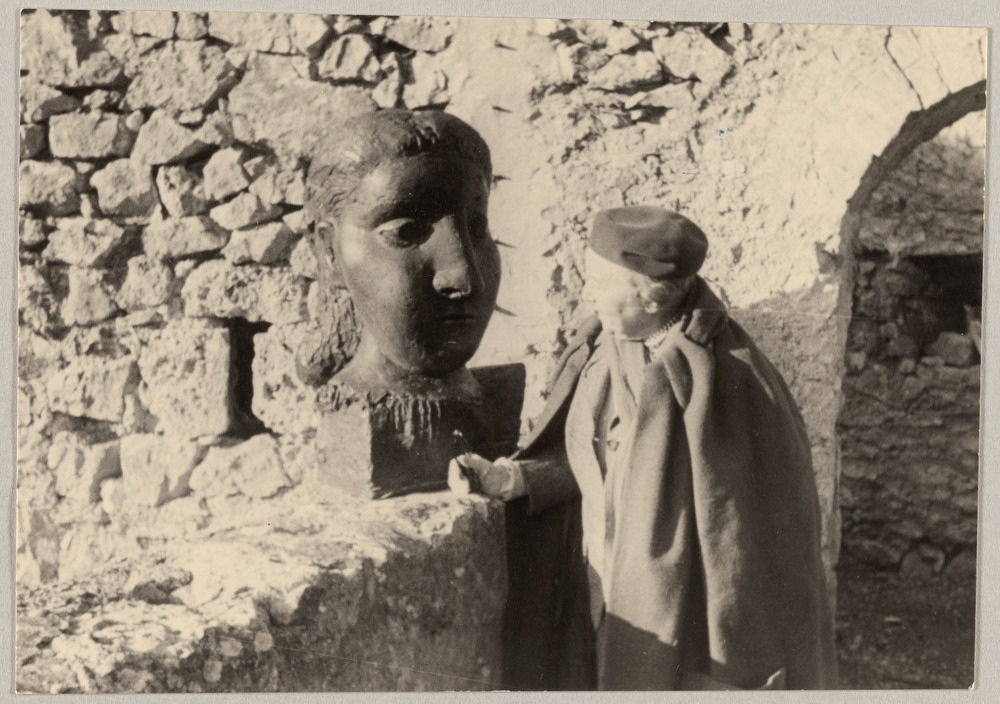Marie Cuttoli contemplant le bronze "Tête de femme (Dora Maar)" dans le jardin du Château de Vauvenargues