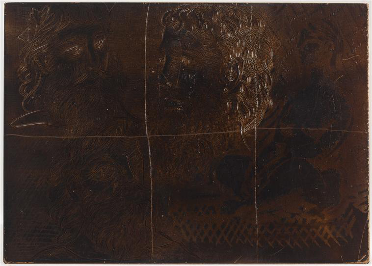 Aquatinte au sucre, grattoir, burin et eau-forte sur cuivre. Plaque rayée et vernie