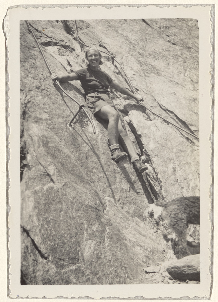 Marie-Thérèse Walter en train d'escalader la cheminée du Brévent à 2500m, Chamonix, le 6 août 1938