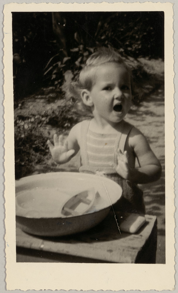 Martine en train de jouer dans un jardin, à Dinard, en juillet 1949
