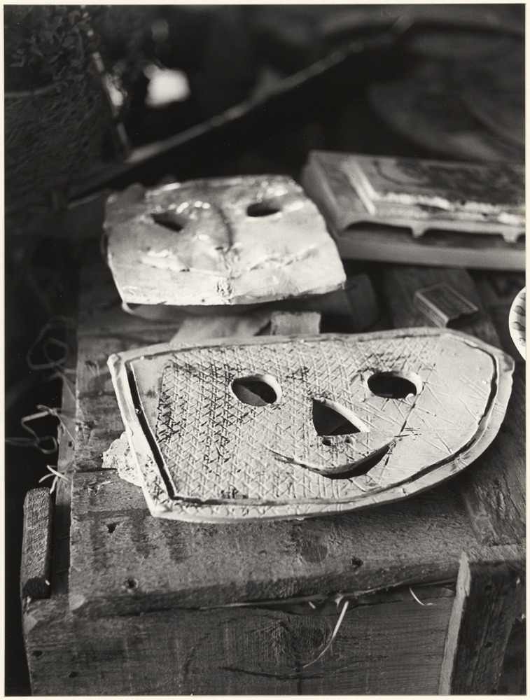 Masques en céramique sur l'établi de l'atelier Madoura, Vallauris, en [1953]