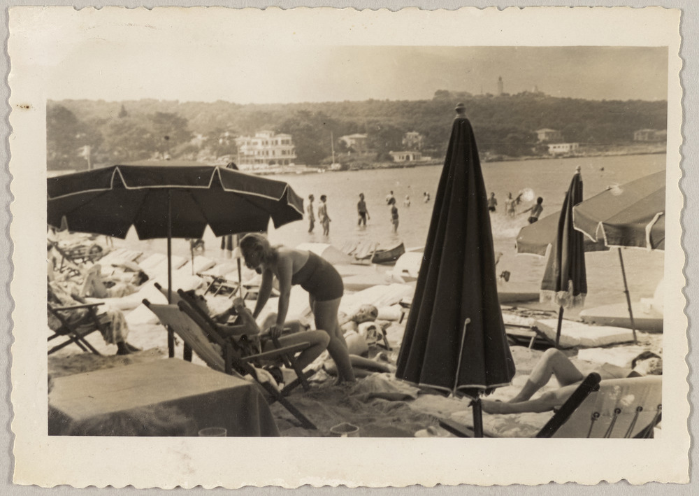 Maya et une amie sur la plage de la Garoupe, Cap d'Antibes, en été 1956