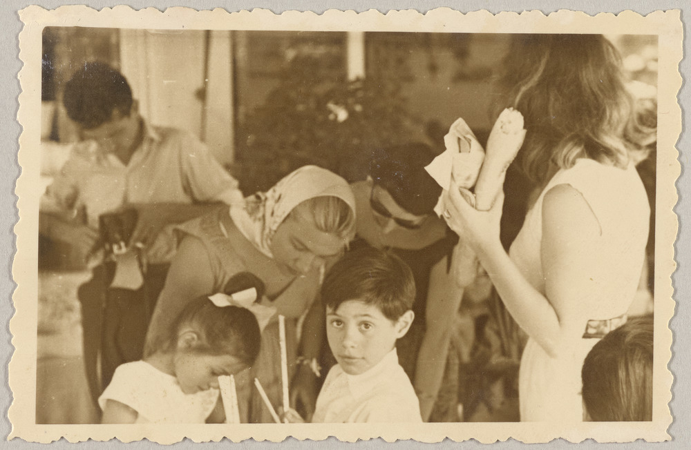 Maya, Paloma et Claude Picasso avec Florette Lartigue au restaurant, plage de la Garoupe, Cap d'Antibes, en été 1955
