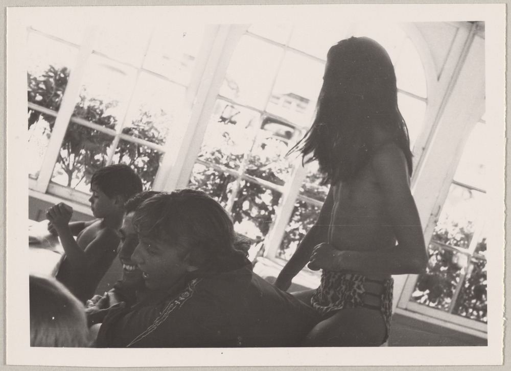 Maya Picasso avec Javier Vilató Ruiz et Caroline Lemort sur son dos, au restaurant Chez Tetou, Golfe-Juan, été 1954