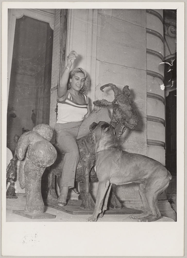 Maya sur "La Chèvre" jouant avec Yan le boxer, à côté de la sculpture "Tête de…