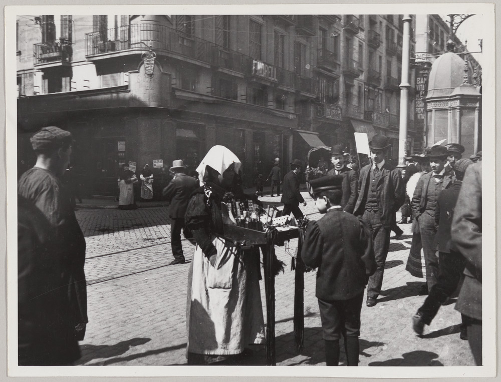 Mercière ambulante à hauteur de la carrer de l'Hospital, La Rambla dels Caputxins (del Centre), Barcelone, en 1907-08